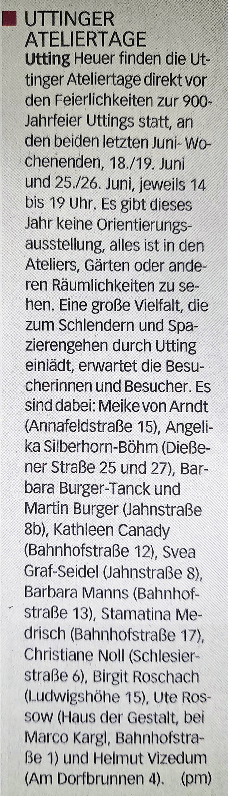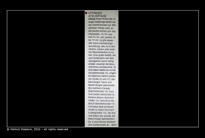 Presseankündigung für die Uttinger Ateliertage im Landsberger Tagblatt, 15.06.2022